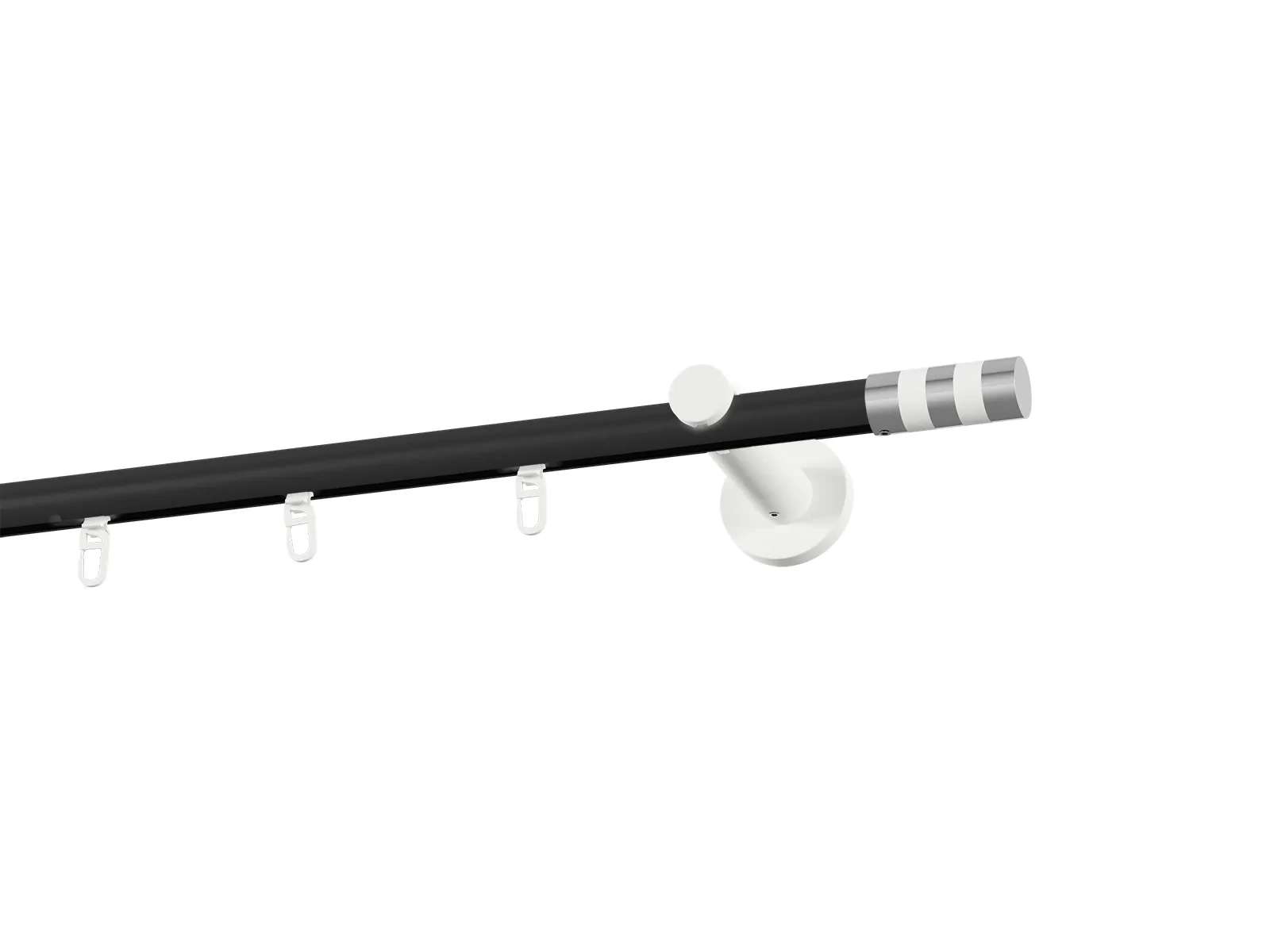 Jednořadá drážková garnýž s povrchovou úpravou - černo bílá lakovaná. Garnyže jsou dodávány jsou v kompletech. Tvar koncovky a typ držáku dle zadaného výběru.