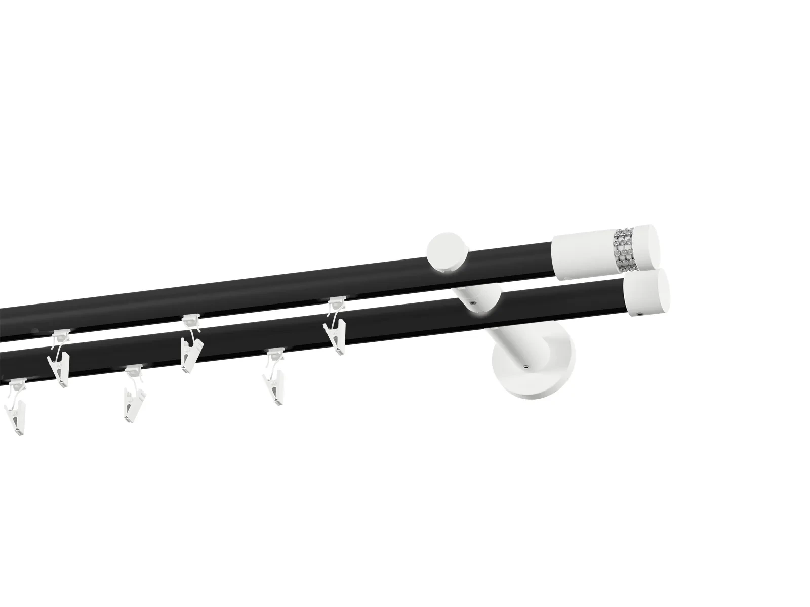 Dvouřadá drážková garnýž s povrchovou úpravou - černo bílá lakovaná. Garnyže jsou dodávány jsou v kompletech. Tvar koncovky a typ držáku dle zadaného výběru.