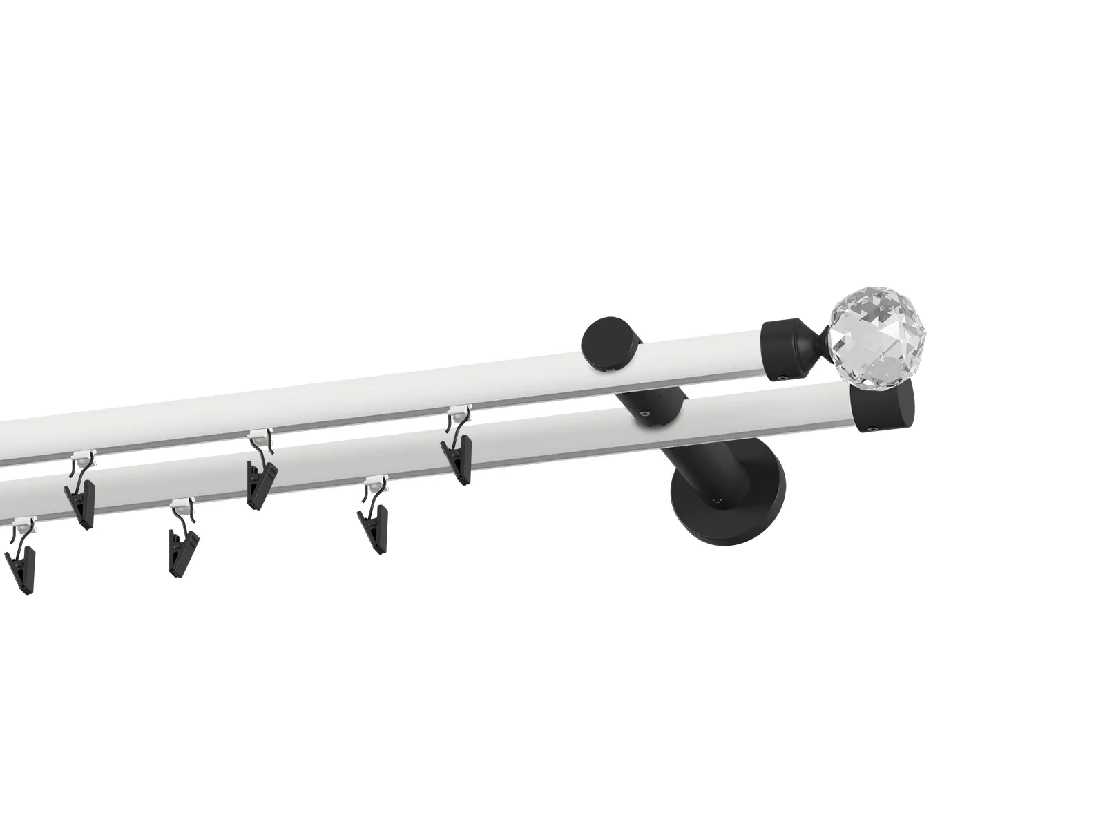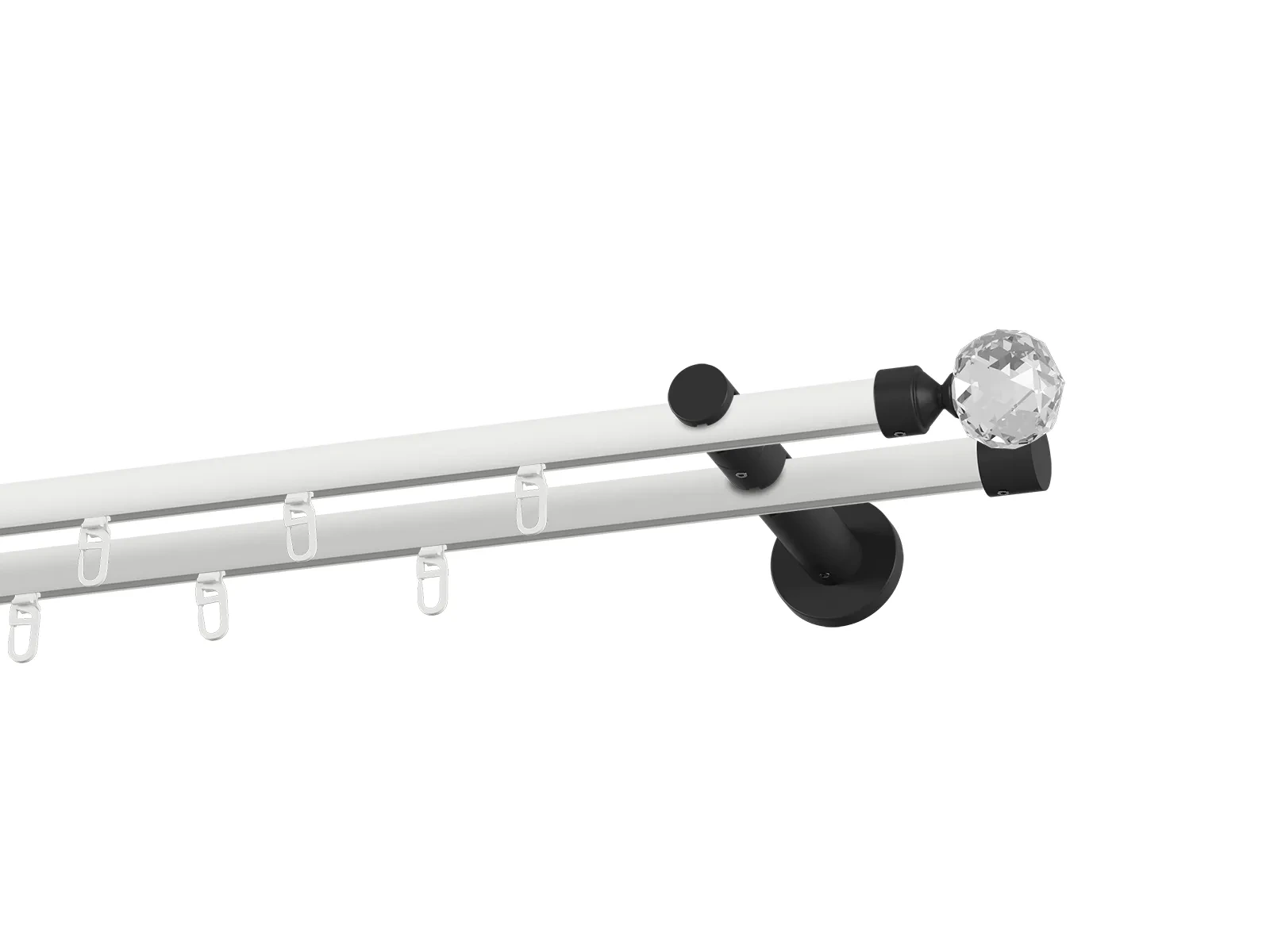 Dvouřadá drážková garnýž s povrchovou úpravou - bílo černá lakovaná. Garnyže jsou dodávány jsou v kompletech. Tvar koncovky a typ držáku dle zadaného výběru.