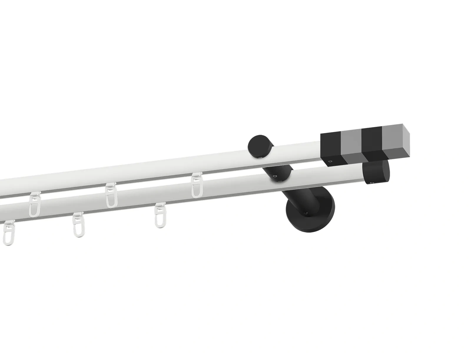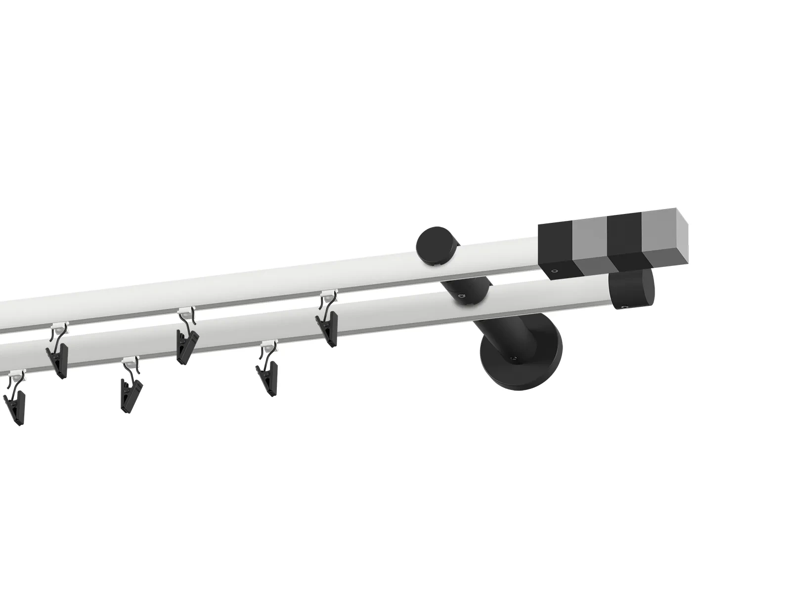 Dvouřadá drážková garnýž s povrchovou úpravou - bílo černá lakovaná. Garnyže jsou dodávány jsou v kompletech. Tvar koncovky a typ držáku dle zadaného výběru.