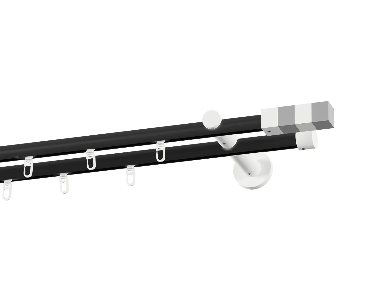 Dvouřadá drážková garnýž s povrchovou úpravou - černo bílá lakovaná. Garnyže jsou dodávány jsou v kompletech. Tvar koncovky a typ držáku dle zadaného výběru.