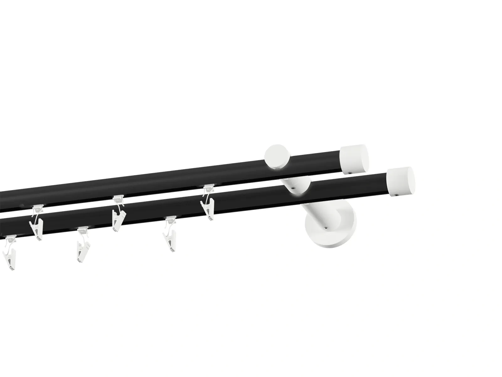 Dvouřadá drážková garnýž s povrchovou úpravou - černo bílá lakovaná. Garnyže jsou dodávány jsou v kompletech. Tvar koncovky a typ držáku dle zadaného výběru.