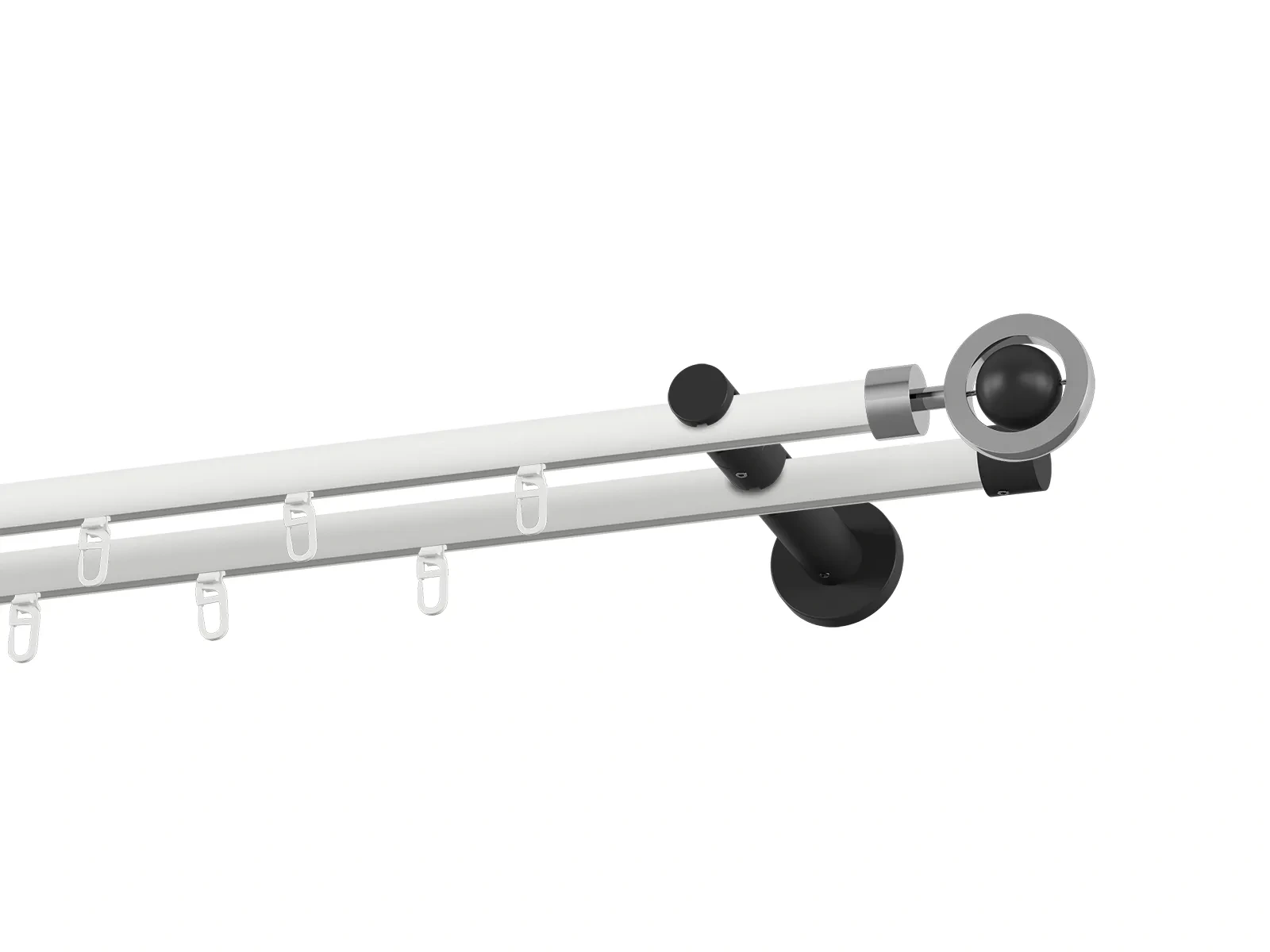 Dvouřadá drážková garnýž s povrchovou úpravou - bílo černá lakovaná. Garnyže jsou dodávány jsou v kompletech. Tvar koncovky a typ držáku dle zadaného výběru.