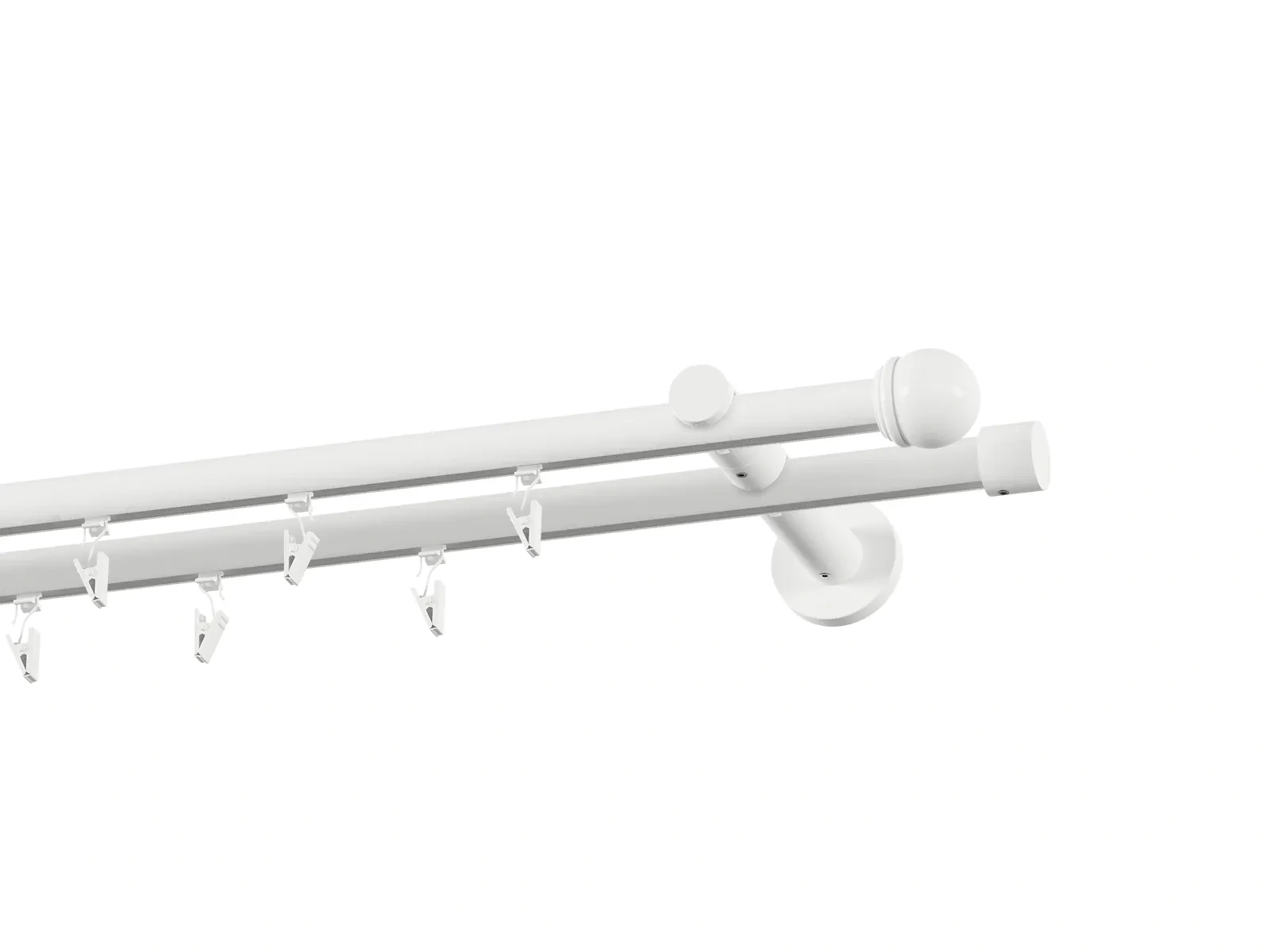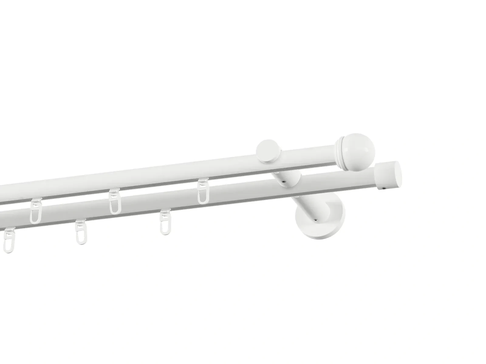 Dvouřadá drážková garnýž s povrchovou úpravou - bílá lakovaná. Garnyže jsou dodávány jsou v kompletech. Tvar koncovky a typ držáku dle zadaného výběru.