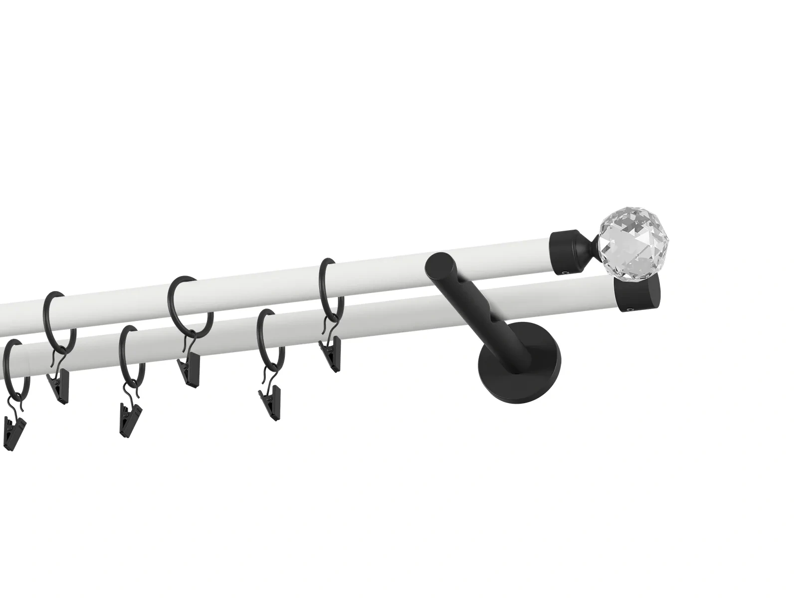 Dvouřadá garnýž s povrchovou úpravou - bílo černá lakovaná. Garnyže jsou dodávány jsou v kompletech. Tvar koncovky a typ držáku dle zadaného výběru.