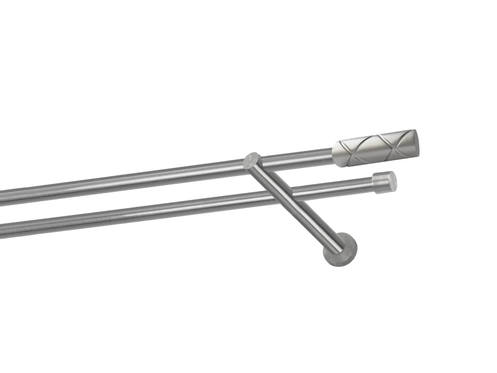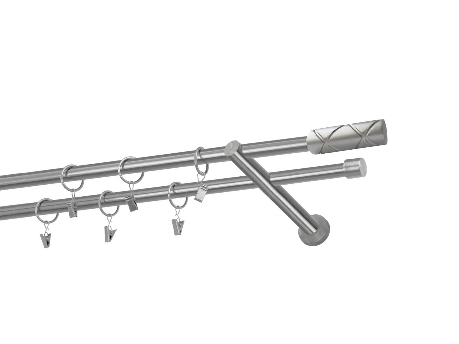 Dvouřadá garnýž s povrchovou úpravou - odstín satin (matné stříbro). Celokovová garnýž s kvalitní povrchovou úpravou - galvanické pokovování. Galvanické pokovování zabezpečuje vyšší povrchovou tvrdost, zvýšenú dolnost vůči poškrábání, hladký povrch. Dodávané jsou v kompletech.