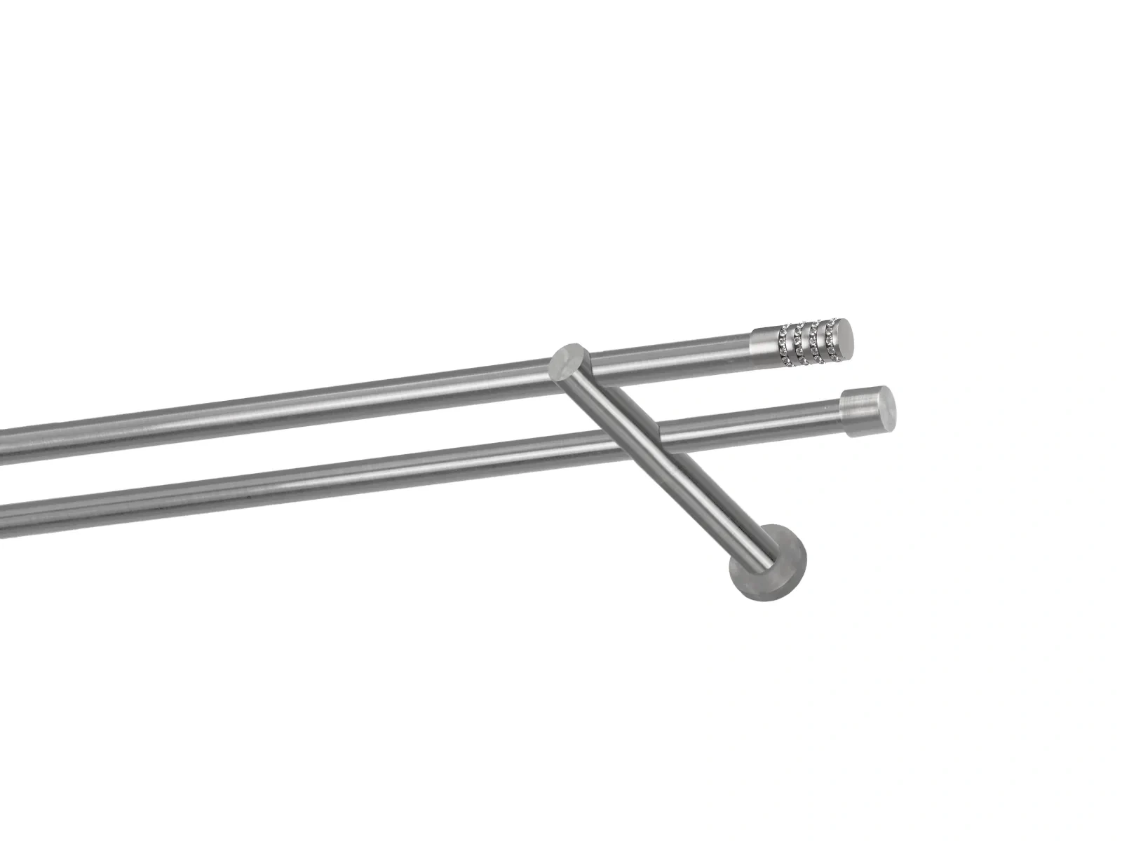 Dvouřadá garnýž s povrchovou úpravou - odstín satin (matné stříbro). Celokovová garnýž s kvalitní povrchovou úpravou - galvanické pokovování. Galvanické pokovování zabezpečuje vyšší povrchovou tvrdost, zvýšenú dolnost vůči poškrábání, hladký povrch. Dodávané jsou v kompletech.