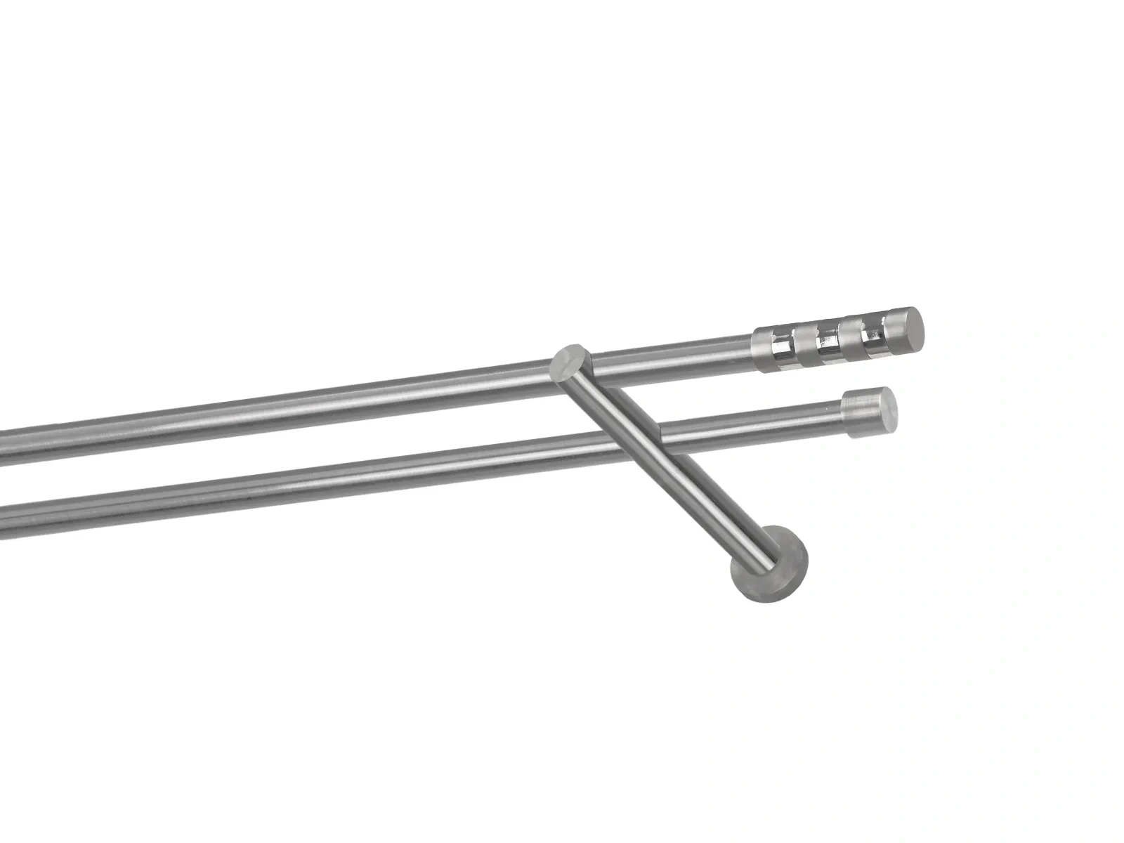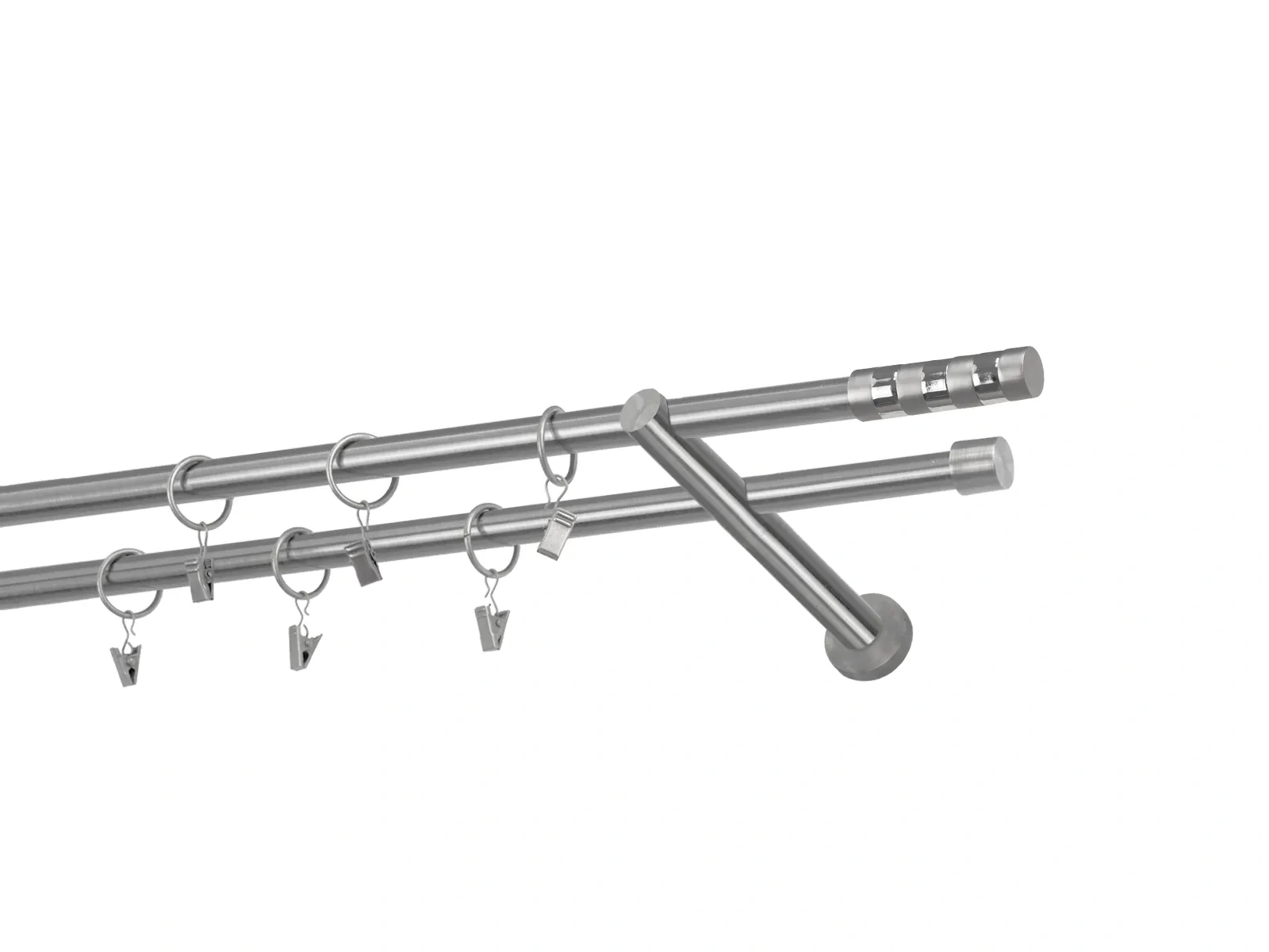 Dvouřadá garnýž s povrchovou úpravou - odstín satin (matné stříbro). Celokovová garnýž s kvalitní povrchovou úpravou - galvanické pokovování. Galvanické pokovování zabezpečuje vyšší povrchovou tvrdost, zvýšenú dolnost vůči poškrábání, hladký povrch. Dodávané jsou v kompletech.