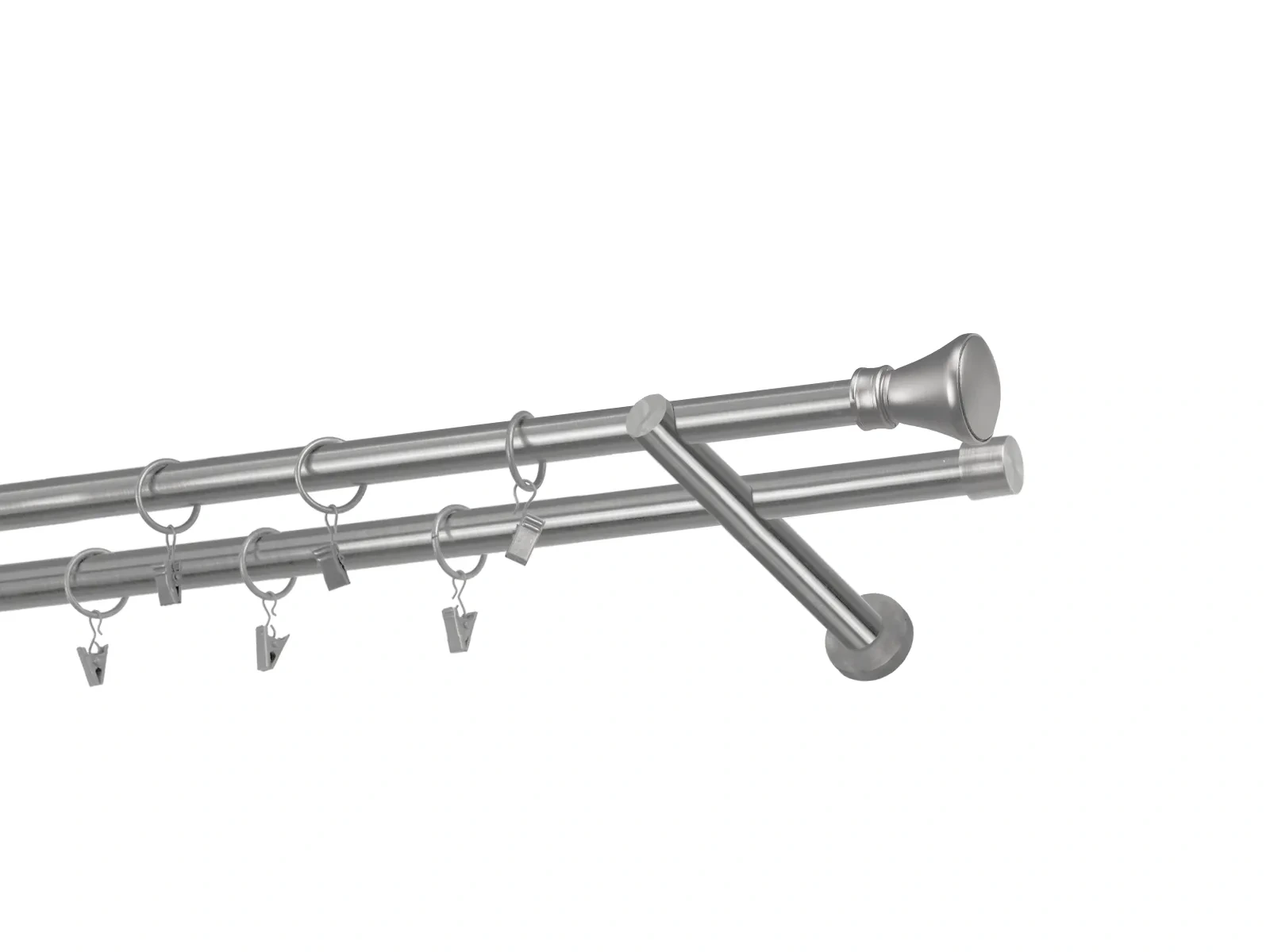 Dvouřadá garnýž s povrchovou úpravou - odstín satin (matné stříbro). Celokovová garnýž s kvalitní povrchovou úpravou - galvanické pokovování. Galvanické pokovování zabezpečuje vyšší povrchovou tvrdost, zvýšenú dolnost vůči poškrábání, hladký povrch. Dodávané jsou v kompletech.
