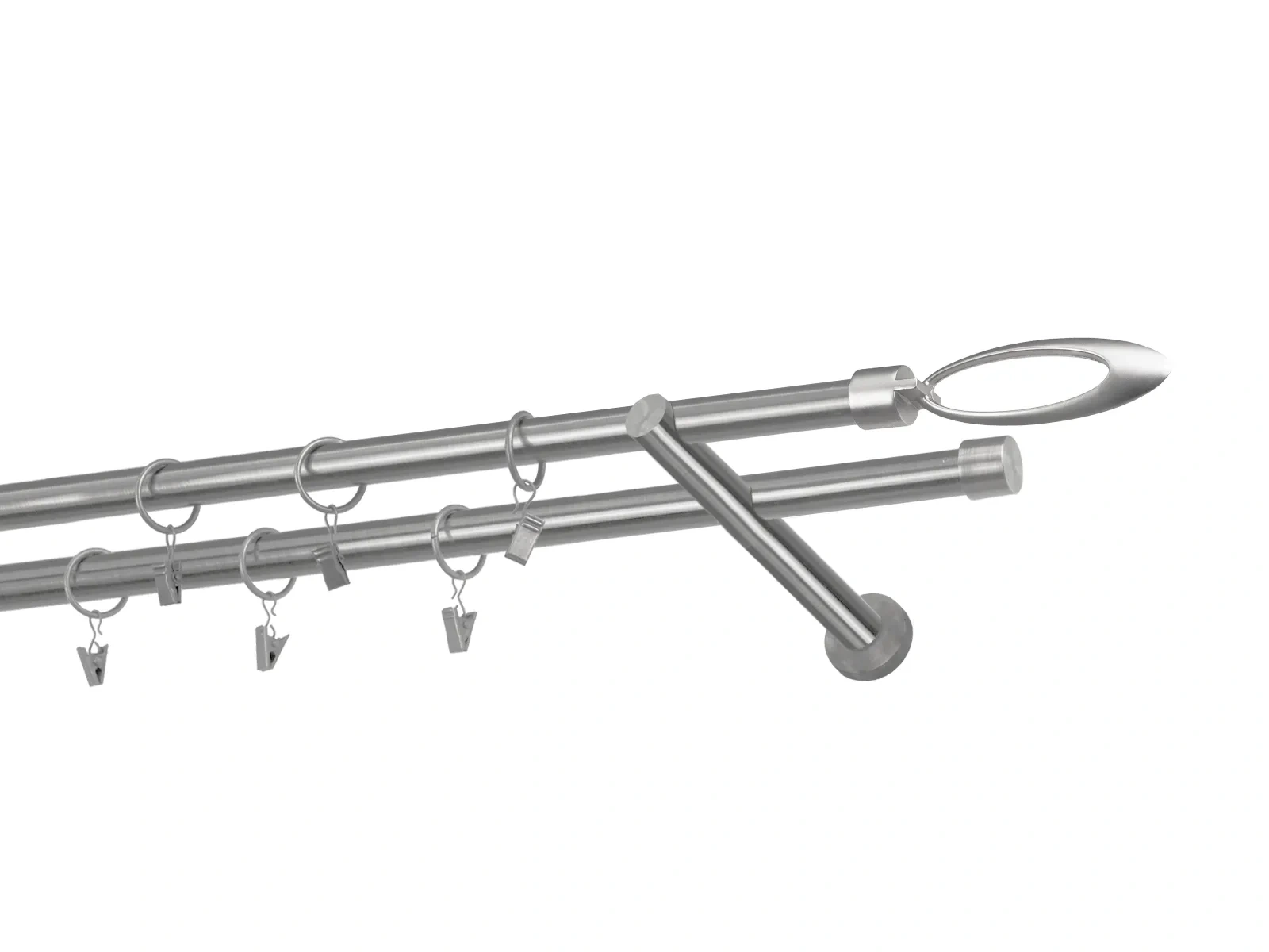 Dvouřadá garnýž s povrchovou úpravou - odstín satin (matné stříbro). Celokovová garnýž s kvalitní povrchovou úpravou - galvanické pokovování. Galvanické pokovování zabezpečuje vyšší povrchovou tvrdost, zvýšenú dolnost vůči poškrábání, hladký povrch. Dodávané jsou v kompletech.