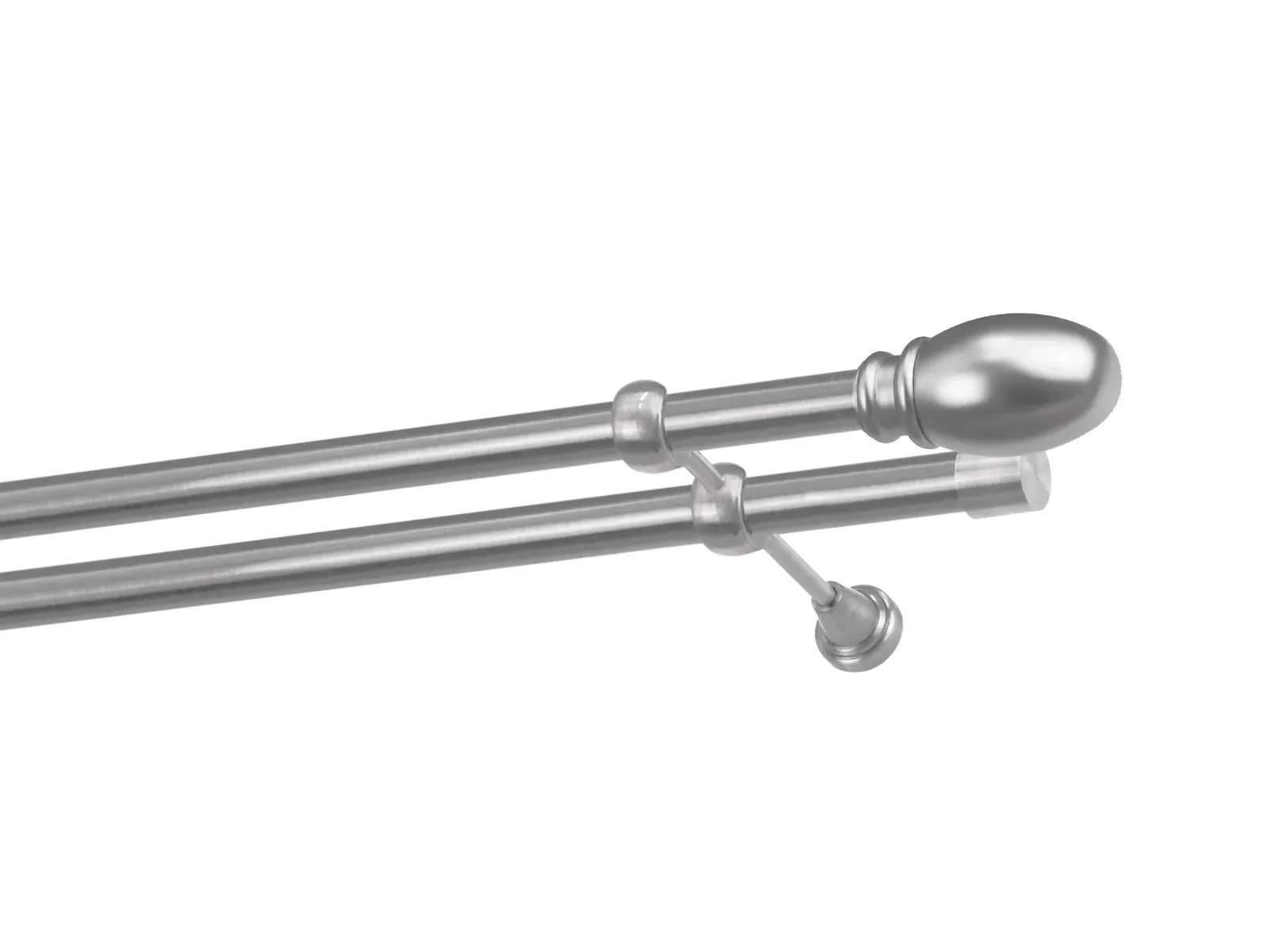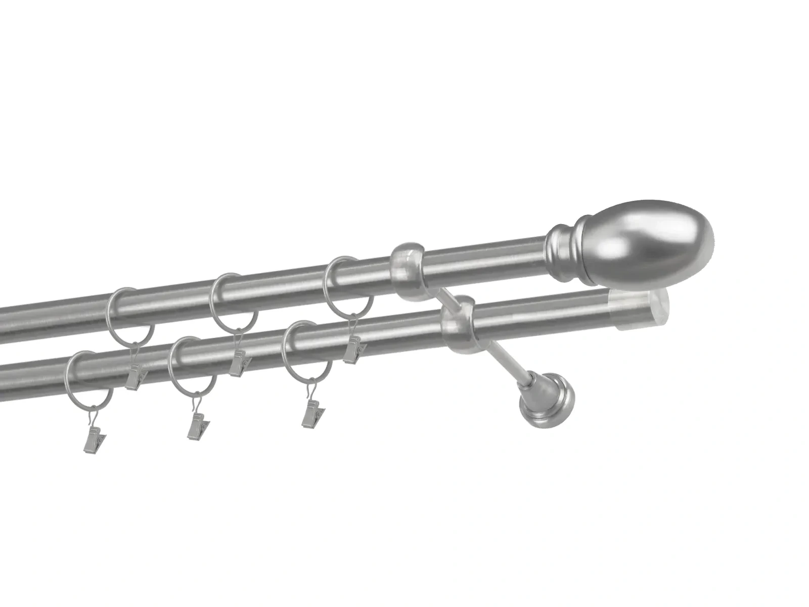 Dvouřadá garnýž s povrchovou úpravou - odstín satin (matné stříbro). Celokovová garnýž s kvalitní povrchovou úpravou - galvanické pokovování. Galvanické pokovování zabezpečuje vyšší povrchovou tvrdost, zvýšenú dolnost vůči poškrábání, hladký povrch. Dodávané jsou v kompletech.