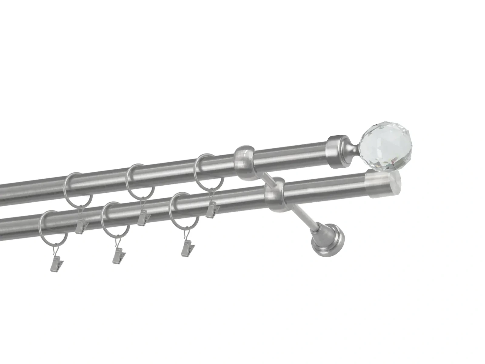 Dvouřadá garnýž s povrchovou úpravou - odstín satin (matné stříbro). Celokovová garnýž s kvalitní povrchovou úpravou - galvanické pokovování. Galvanické pokovování zabezpečuje vyšší povrchovou tvrdost, zvýšenú dolnost vůči poškrábání, hladký povrch. Dodávané jsou v kompletech.