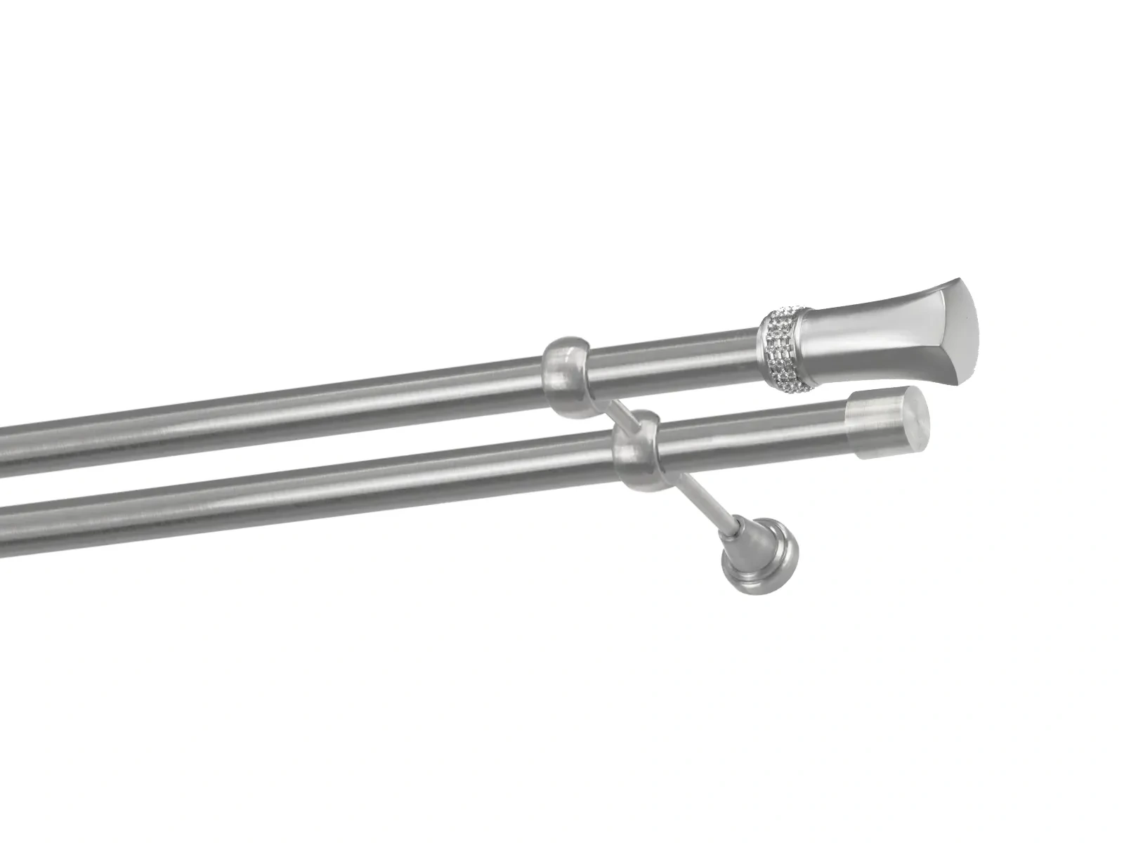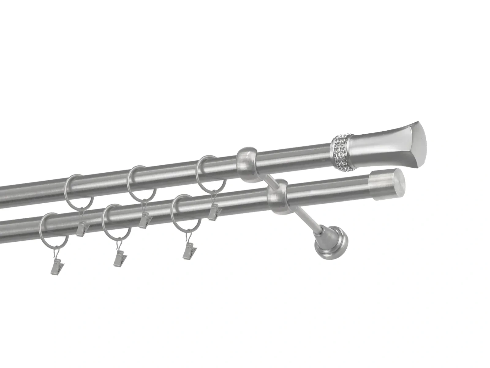 Dvouřadá garnýž s povrchovou úpravou - odstín satin (matné stříbro). Celokovová garnýž s kvalitní povrchovou úpravou - galvanické pokovování. Galvanické pokovování zabezpečuje vyšší povrchovou tvrdost, zvýšenú dolnost vůči poškrábání, hladký povrch. Dodávané jsou v kompletech.