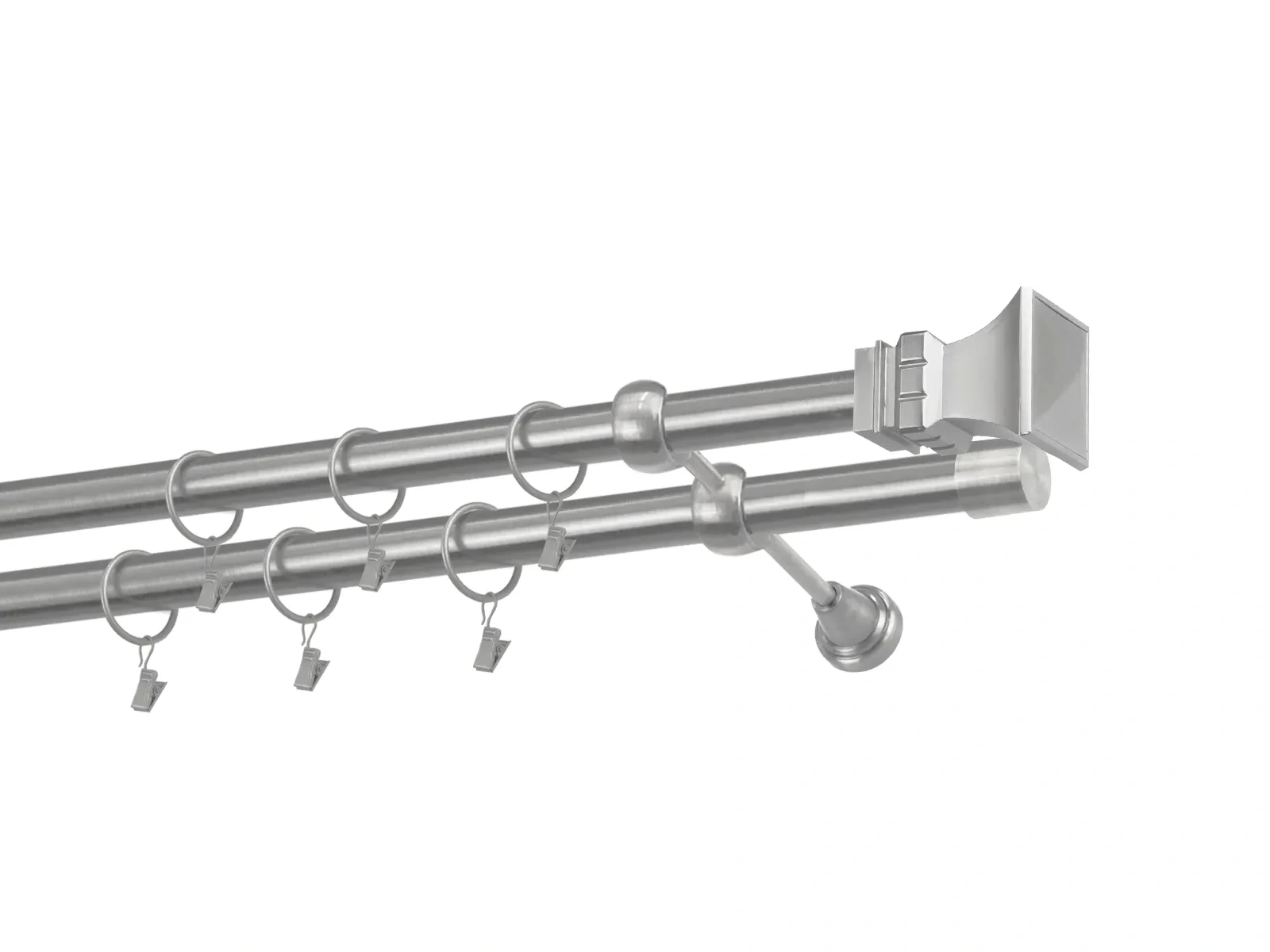 Dvouřadá garnýž s povrchovou úpravou - odstín satin (matné stříbro). Celokovová garnýž s kvalitní povrchovou úpravou - galvanické pokovování. Galvanické pokovování zabezpečuje vyšší povrchovou tvrdost, zvýšenú dolnost vůči poškrábání, hladký povrch. Dodávané jsou v kompletech.