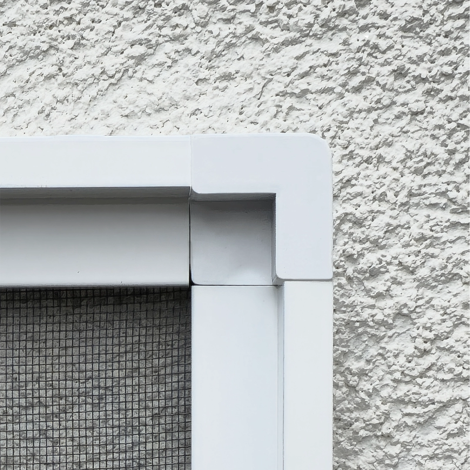Sítě proti hmyzu na OKNO – pevné KLIK LUX se odlišují od základního modelu v tom, že rohový spojovač je vnitřní a tedy pohledově neviditelný. Profily jsou řezány pod úhlem 45°.