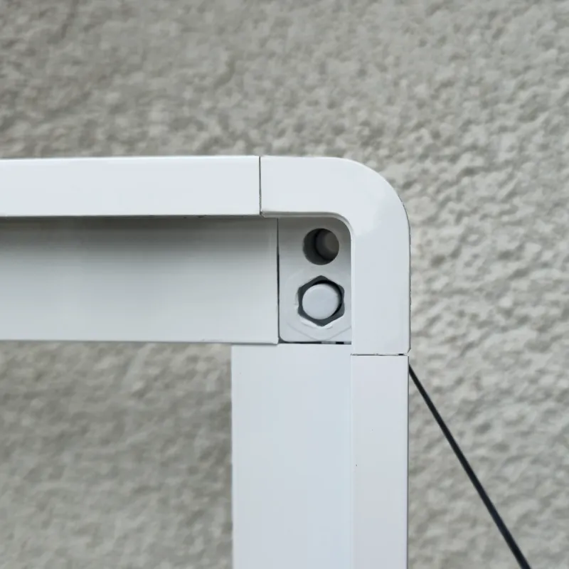 U modelu LUX jsou řezané pod 45° úhlem a rohový spojovač je vnitřní a tedy pohledově neviditelný. Napínání je přímo v profilu, kdy stačí posunout napínák v profilu, bez potřeby demontáže výrobku.